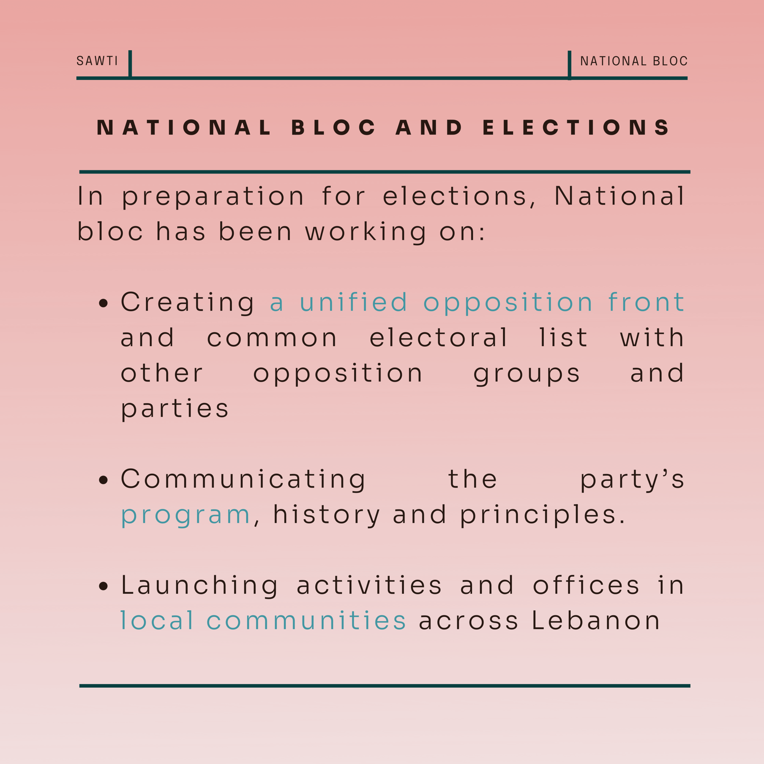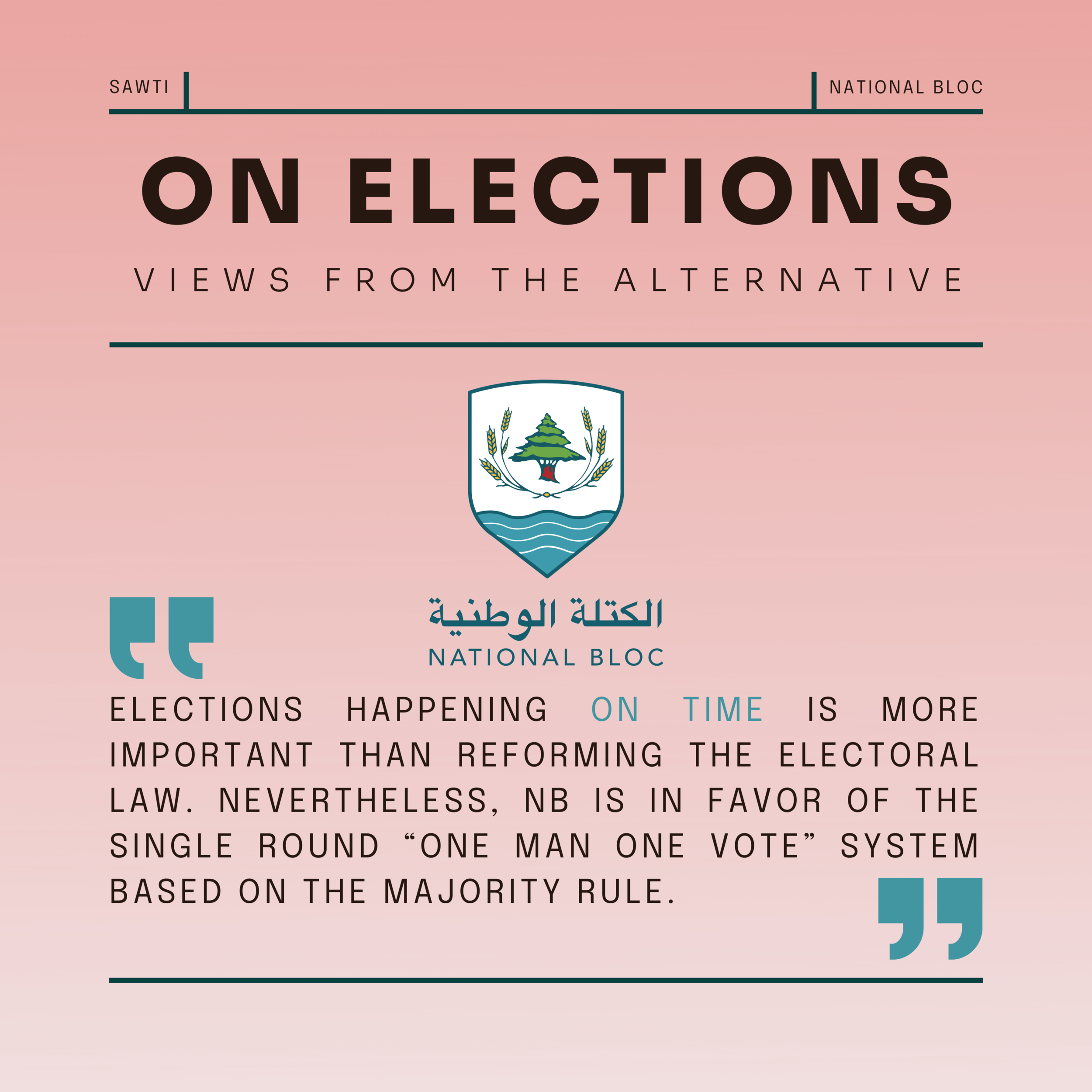 National Bloc is a social, democratic, and secular party that aims and works to achieve a prosperous, green, and fair Lebanon.