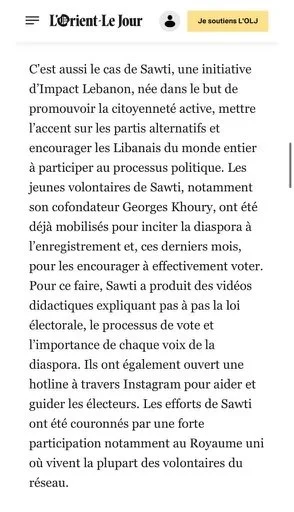 Sawti, which means both “my voice” and “my vote” in Arabic, is a volunteer-led grassroots initiative started within Impact Lebanon that aims to promote active citizenship among Lebanese people around the world. Sawti was established and is led by volunteers with no political affiliations that are based around the world that met through Impact Lebanon. These volunteers come from diverse professional and educational backgrounds, including law, science, engineering, international development, public policy, journalism, and media and communications. For more information, visit us at www.sawtivoice.org.